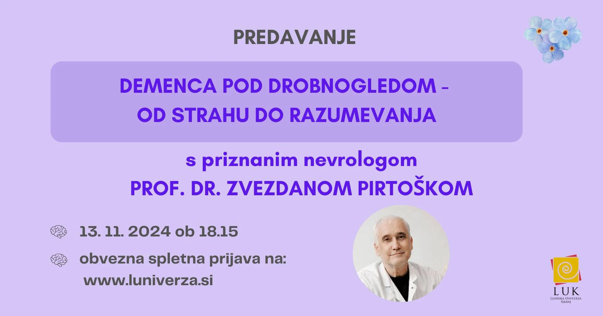 Predavanje bo vodil prof. dr. Zvezdan Pirtošek, priznani in ugledni specialist nevrolog, profesor klinične nevrologije in predstojnik Katedre za nevrologijo na Medicinski fakulteti ter eden najvidnejših strokovnjakov za področje demence.