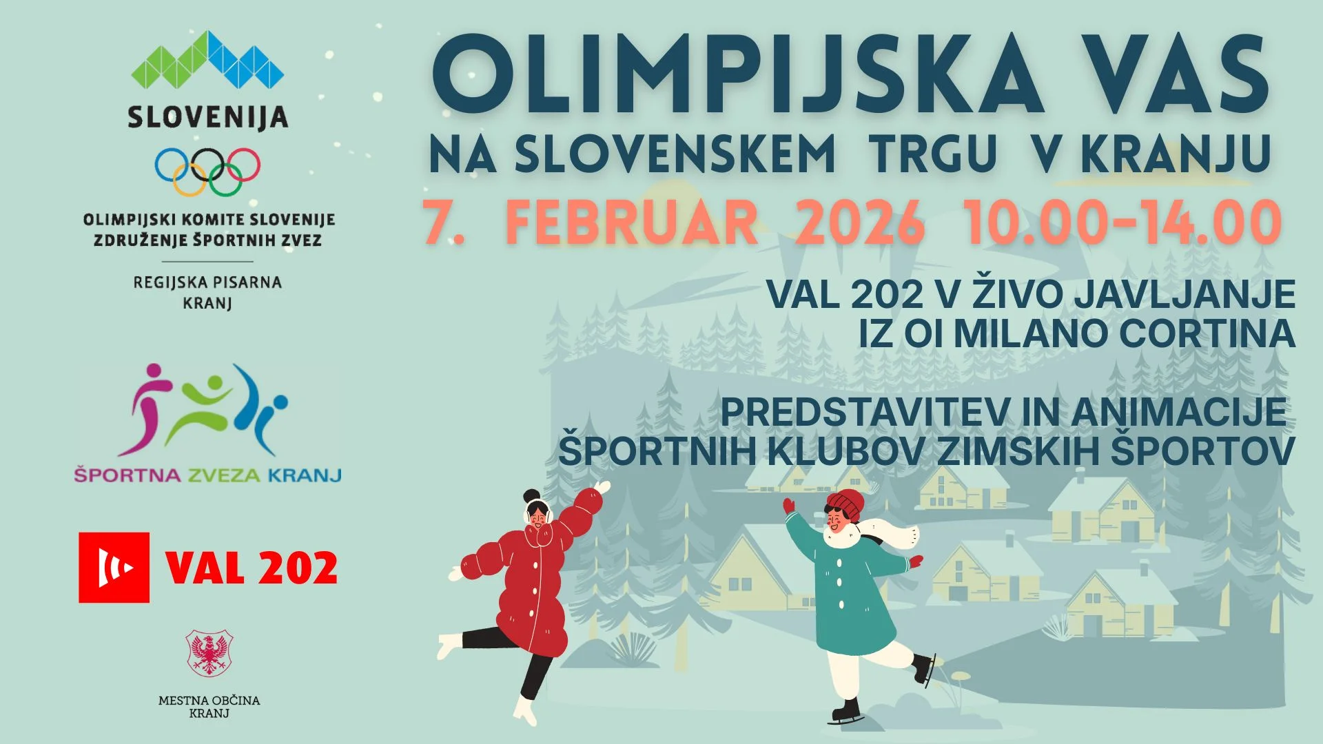 Olimpijsko vzdušje prihaja v Kranj! V času zimskih olimpijskih iger Cortina Milano bomo olimpijski duh pripeljali tudi na Slovenski trg. Športna zveza Kranj, skupaj z Valom 202 in Regijsko pisarno OKS Kranj pripravlja Olimpijsko vas z bogatim športnim dogajanjem.