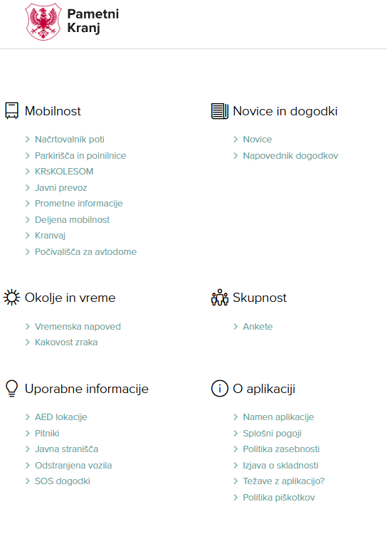 Trenutno so v spletni različici in mobilni aplikaciji Pametni Kranj, ki je na voljo v spletni trgovini Google Play in App(le), naslednji podatki oziroma funkcionalnosti: