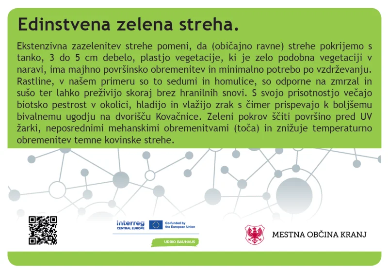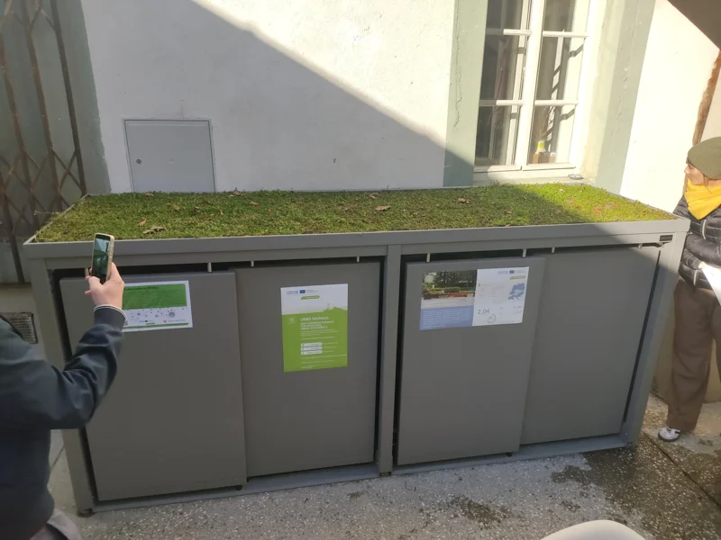 Konec leta 2025 smo na notranjem dvorišču podjetniškega inkubatorja Kovačnica v starem mestnem jedru Kranja vzpostavili edinstveno zeleno streho na kovinskem ogrodju smetnjakov.