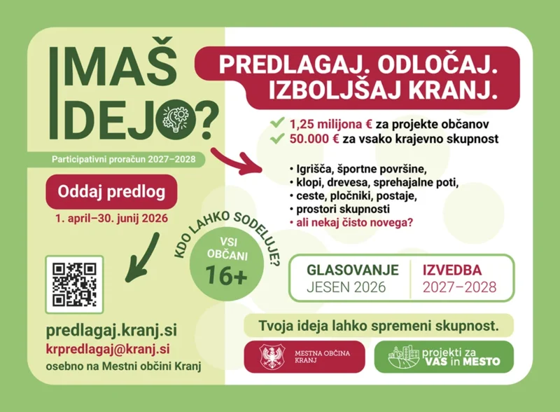 V MOK zdaj k sodelovanju vabijo vse občanke in občane MOK, stare 16 let in več. Med 1. aprilom in 30. junijem 2026 bo namreč potekalo zbiranje predlogov, ki jih je mogoče oddati prek spletne strani predlagaj.kranj.si, po elektronski pošti na krpredlagaj@kranj.si ali osebno v sprejemni pisarni v občine. Za tiste, ki bi potrebovali pomoč pri oblikovanju ideje, bodo na MOK pripravili tudi posvete. Po zaključku zbiranja bo predloge pregledala strokovna komisija, ki bo preverila njihovo izvedljivost in skladnost s pogoji. Projekte, ki bodo zadostili pogojem, bodo uvrstili na glasovanje, ki bo potekalo med 18. septembrom in 11. oktobrom 2026. Občani bodo odločili, katere projekte bo občina izvedla v 2027 in 2028 v njihovi krajevni skupnosti.
