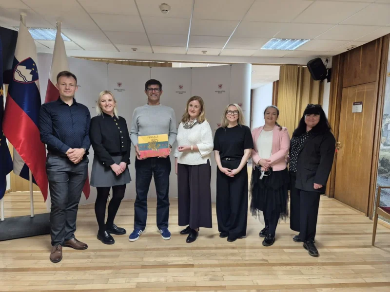 Župan Kranja Matjaž Rakovec in podžupanja Manja Zorko sta z litovskimi profesoricami in profesorjem na izmenjavi ter profesorico Gimnazije Kranj spregovorila tudi o konceptih zelenega, trajnostnega in pametnega mesta.